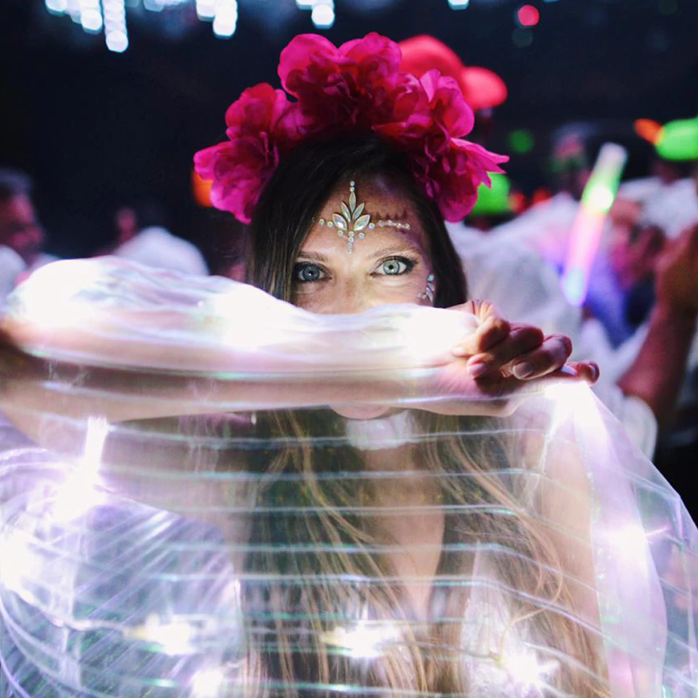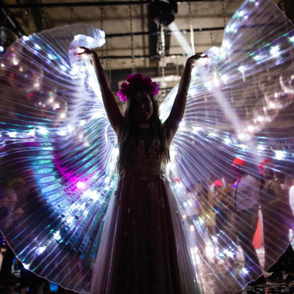 Hecha en tela translúcida tornasol irisdicente con luces LED incorporadas, esta capa fluye con elegancia y brilla con intensidad. Ideal para quien quiere deslumbrar sin límites.